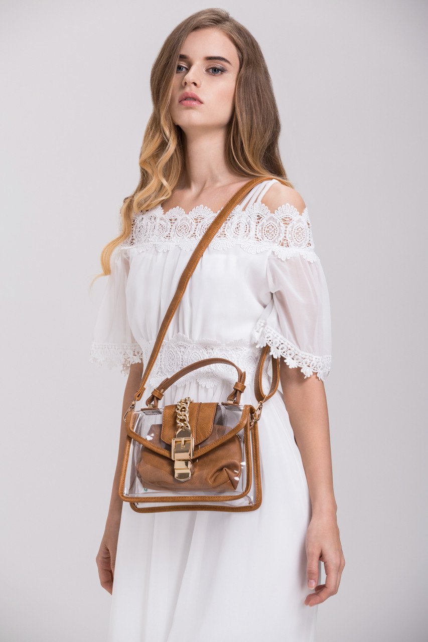 Make a bold statement with your accessory choices by adding the OwnTheLooks brown trim transparent handbag to your closet. Gold metallic chain details and hardware features add a pop of shimmer to this unique transparent purse so you can carry your belongings in style