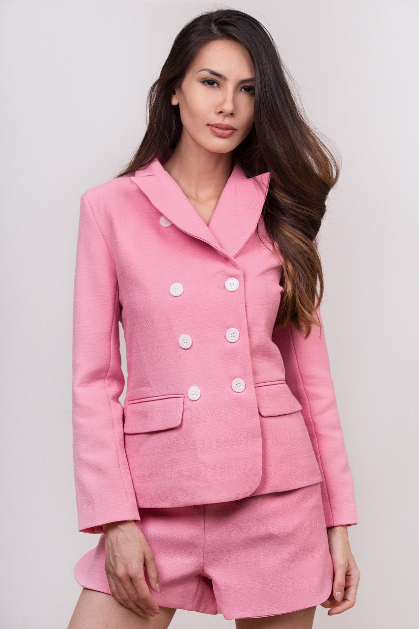 Peak lapels and double-breasted buttons give this classic blazer set from OwnTheLooks an authoritativ yet  sweet look.